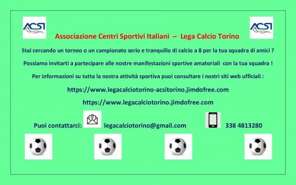 Amici sportivi, preparatevi! ACSI Lega Calcio Torino è entusiasta di annunciare il nuovo "Campionato amatoriale di calcio a 8" che partirà a Ottobre 2025! Se siete una squadra seria e cercate un'opportunità per divertirvi in un contesto tranquillo e professionale, questo è l'evento...