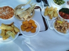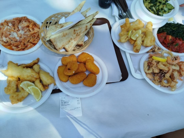 Ristorante Piatto D'oro loc Branca (PG). Pranzo per due persone composto da; 1 porzione di caramelle (pasta ripiena) con sugo basilico e pinoli 1porzione cannelloni alla carne (6 pezzi) 1 Grigliata mista con patate fritte 1milanese con contorno di cicoria 1 bottiglia di acqua 2 caffè...