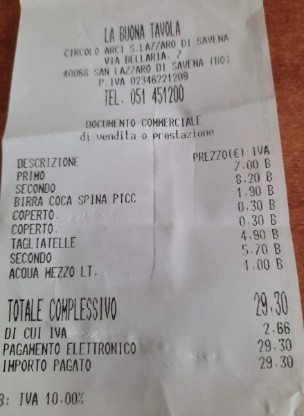 Bologna mi sono fermato a pranzo all'Arci San Lazzaro che sempre una garanzia . NB : pur essendo all' interno della struttura il risto self service non è un circolo ma locale pubblico Abbiamo preso in 2 2 tagliatelle 2 spezzatino con patate 1 contorno (cicoria ) 2 bottiglie...