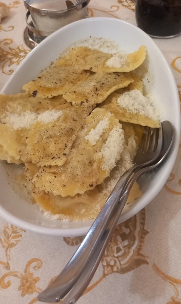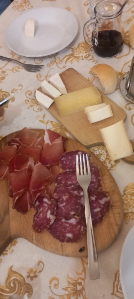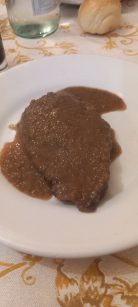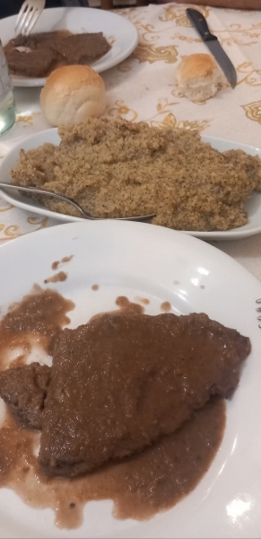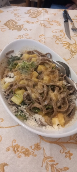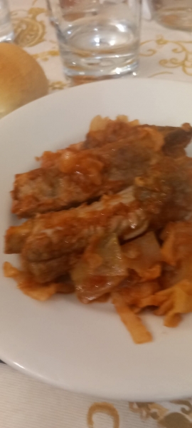 Oggi sabato a pranzo in 2 con menù fisso alla trattoria la Rosa a Ghedi ( brescia) un piatto di linguine con crema di peperoni e scamorza, uno spaghetto alla diavola, un baccalà con patatine e un baccalà con peperonata , mezzo litro di vino, una bottiglia d'acqua e un caffè, per un totale di 34...