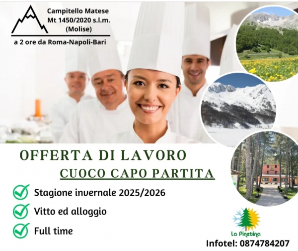 per ampliamento organico stiamo cercando un cuoco/a per stagione invernale 2024/25 offriamo vitto e alloggio siamo in montagna in provincia di Campobasso (Molise) se interessato/a mandaci un curriculum dettagliato infolapinetina@campitello.com www.lapinetina.it